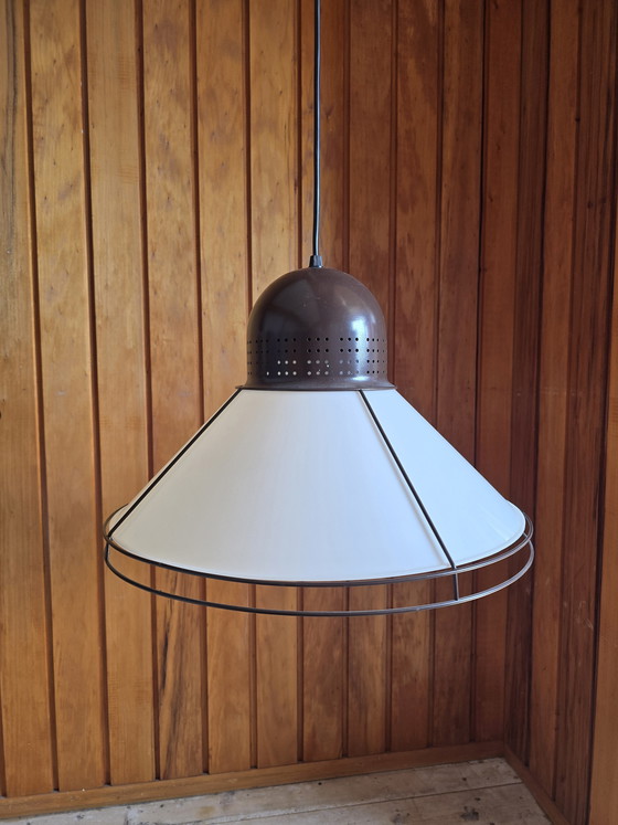 These iconic pendant lamps by Woja Holland are a rare find as a pair. They are characterized by the typical brown, perforated metal top and a large conical white shade. The architectural metal frame surrounding the shade completes the design.