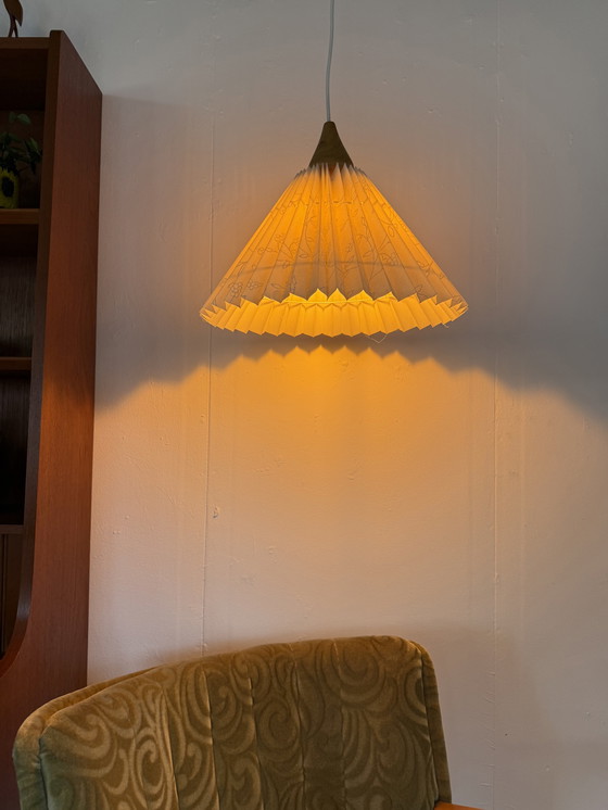 Beautiful pendant lamp. Solid pine ceiling and fixture. The lamp has a pleated fabric shade with a floral pattern. The lamp has a standard E27 socket, which diffuses the light beautifully thanks to the shade. In very good condition.