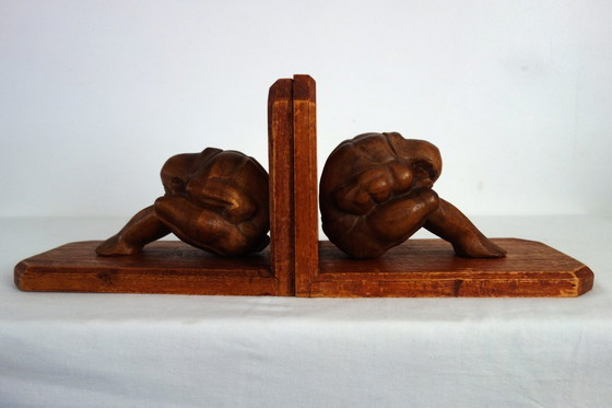 Pair of carved wooden bookends depicting the Weeping Buddha or Weeping Yogi, circa 1960s.