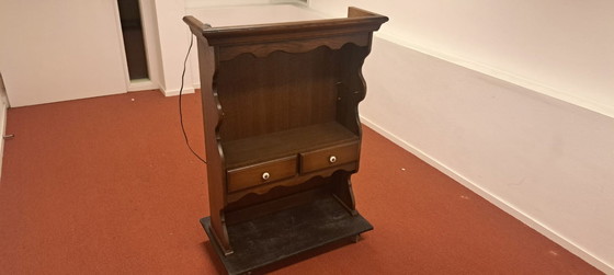 Charming wooden cabinet with a classic, rustic character. This compact piece features open compartments and two drawers, ideal for storing smaller items or decoratively displaying accessories. The warm wood and elegant finish make it a perfect fit for a vintage, rustic, or retro interior.