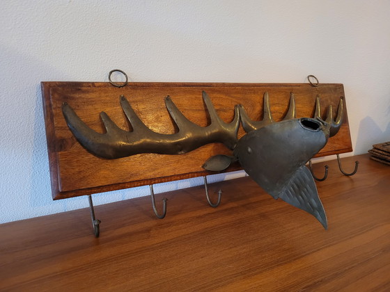 Really cool vintage coat rack made of solid wood with a sculptural metal moose head and antlers. A true statement piece with lots of character. The metal has a nice aged patina and the wood has a warm, natural tone that fits both rustic and eclectic interiors.