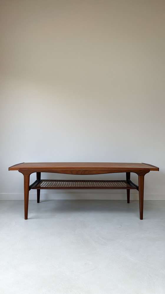 Vintage wooden coffee table with a reversible top. You can choose between a wooden or Formica top. Dimensions: 126W x 51D x 42.5H cm. The table has a beautiful rounded finish and is made even more charming by the wicker shelf underneath. The table is in very good vintage condition, with light signs of use commensurate with its age. The table can only be picked up in Maastricht, or delivery can be arranged in consultation.