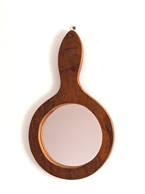 Attractive hand mirror with thick, round wooden frame into which the mirror is integrated, and a handle for holding it.
