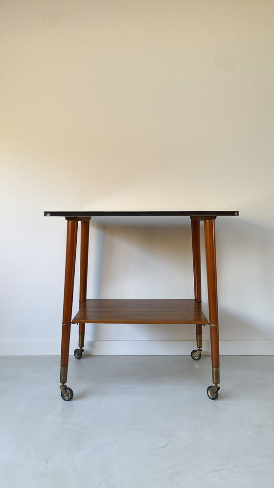 Vintage wooden trolley on wheels with a Formica top. Beautiful thanks to the use of various materials. It's also great that the original wheels are still attached. Dimensions: 72.5W x 47.5D x 72H cm. The trolley is in good vintage condition with minor signs of wear, see photos. Pickup only in Maastricht, or delivery by courier upon request.