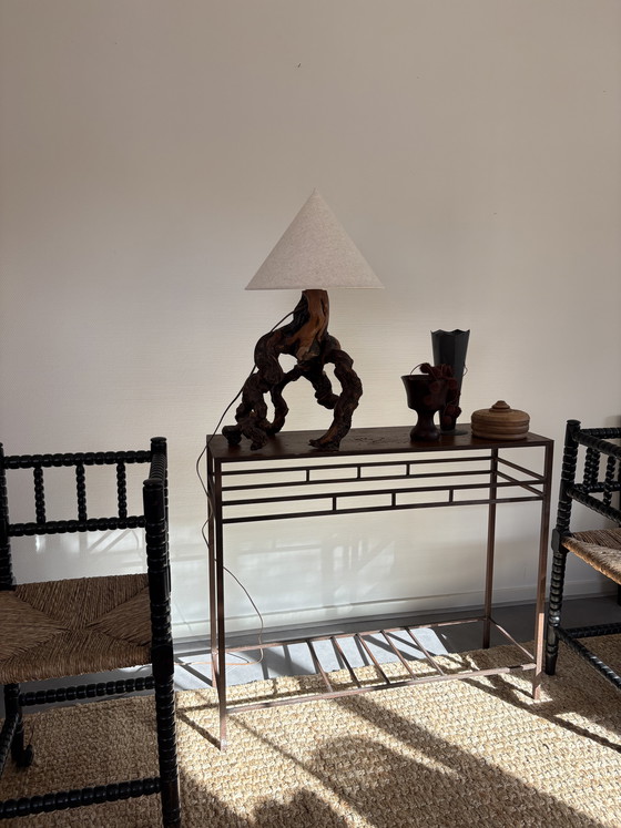 Vintage wrought iron console/side table in Japandi style. Hand-forged item, so there may be imperfections, but I think that is precisely what makes it so characteristic & unique. Patina is present, consistent with its age. Not bothersome at all; it gives a very beautiful look & feel. The flat surface rests loosely on the base. In very good condition. Heavy.