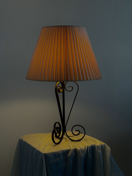 This vintage table lamp features a hand-forged wrought iron base in an elegant swirl shape with a warm brown finish. The combination with the new cream-colored pleated shade with a linen look creates a calm and refined appearance, fitting within the Japandi style.