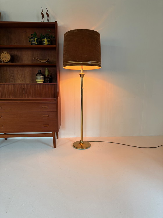 Beautiful large floor lamp. Weighted brass base with a beautiful rounded finish. Thick brass stem with a double E27 socket.