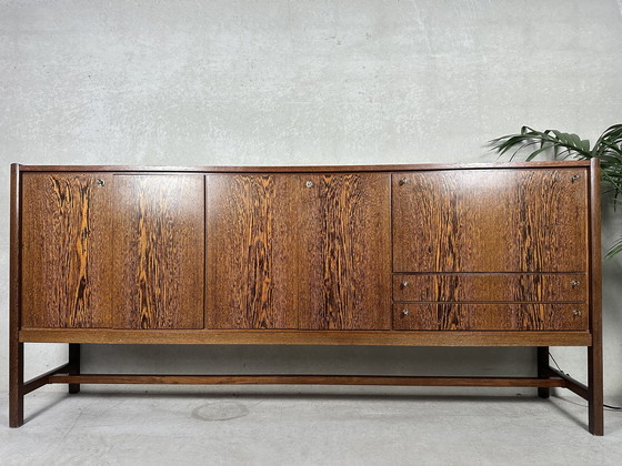 Beautiful 1960s wenge veneer sideboard/highboard with integrated desk and lighting. 4 doors (2 double) and 2 drawers. Equipped with Huwil pulls, locks, and magnets. The left storage compartment has 2 drawers. The piece still has a beautiful sheen. The top has very minor signs of wear (lightly marked in one spot – see photo). Otherwise, normal signs of age. A high-quality, sturdy piece of furniture. Shelves in high-quality oak veneer. Back panel in untreated teak. Height: 114cm. Depth: 48cm. Width: 250cm. See photos or visit us for a better impression.