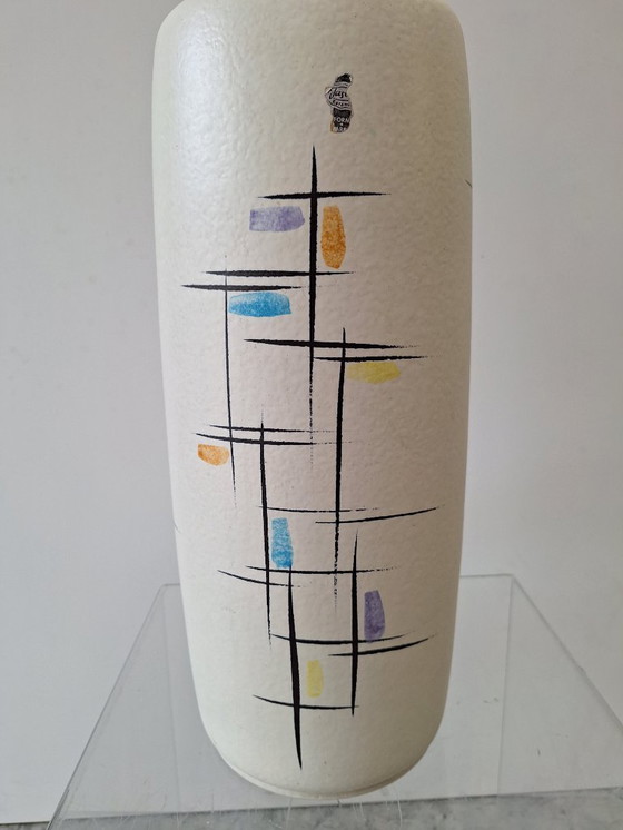 This vintage XL Jasba Keramik vase is a striking piece of abstract art. Its tall, cylindrical form is adorned with a unique geometric pattern in soft pastel hues, making it a perfect statement piece for any room. Crafted in West Germany, this vase embodies mid-century modern design with its clean lines and subtle texture.