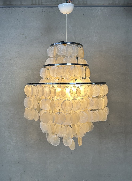 1970s chandelier with real shells. Large item. Large shells. Crown in chrome. 2 x e27 fittings. Diameter: 50cm. Total length: 90cm. Diameter discs: 6cm. Purchased by first owner in 1973. Beautiful condition. Ivory color. Collection is preferred. Send by courier service is possible but then it will be completely disassembled. Weight: 4.2kg. Not labeled.
