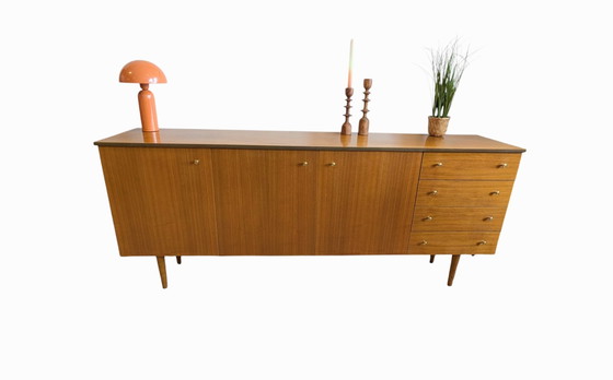 Beautiful vintage sideboard with brass knobs and handles, giving it a stylish look.