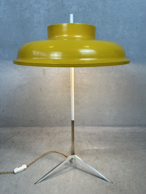 Large vintage table lamp on a brass tripod, presumably Italian. 1950s. Beautiful brass details in the slender yet sturdy base. Large metal shade with a diameter of 44cm. No dents, but signs of use in the form of paint loss (= original yellow color). The white interior was repainted by us because the paint loss was really bothersome when looking under the shade. With a height of 70cm, it is ideal for a low side table. 2 Bakelite E27 sockets. Electrically in perfect working order. Weight: 2.7kg.