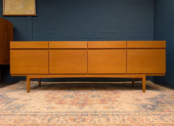 Beautiful and rare large vintage lowboard. This beautiful cabinet, model FA66, was designed by Ib Kofod Larsen and manufactured by Faarup Møbelfabrik. The cabinet was produced in the 1960s and is made of oak.