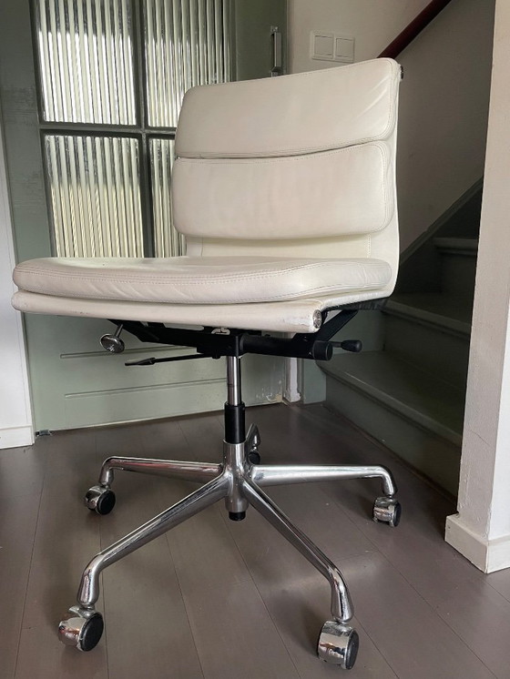 Vitra Eames Ea217 Softpad Chair in white leather. This version comes without armrests, (not missing) designed and made like this so as to easily push under a desk. All tilt and height adjustments work perfectly, some scuffing to the edges but otherwise a very nice well kept chair.