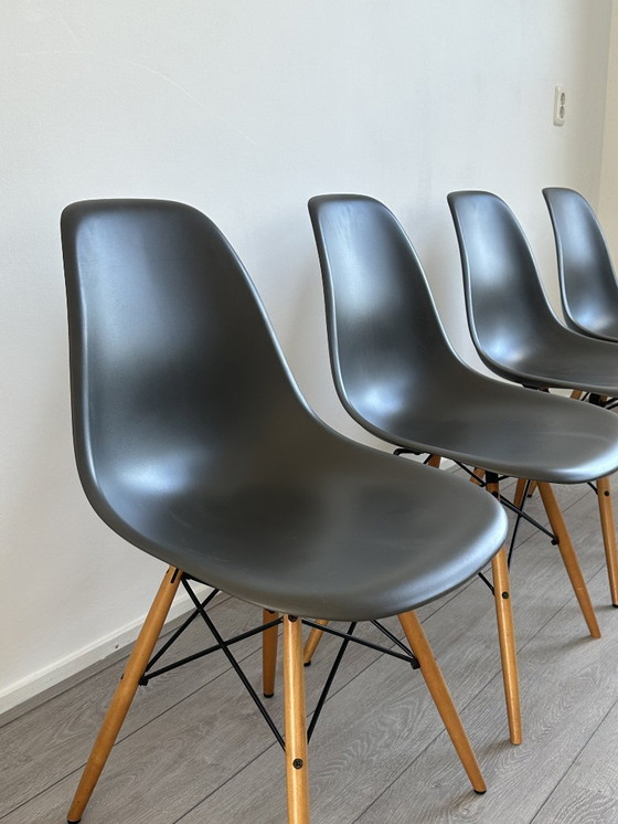 Model: Eames Plastic Side Chair (DSW) with wooden base and black steel cross support. Authentic Vitra chair, with the original label under the seat.
