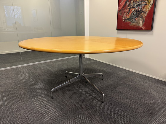 Elevate your dining or meeting space with this exquisite Vitra round table, a perfect blend of elegance and functionality. Crafted with a custom-made cherry wood top, this table exudes warmth and sophistication, making it an inviting centerpiece for any room.