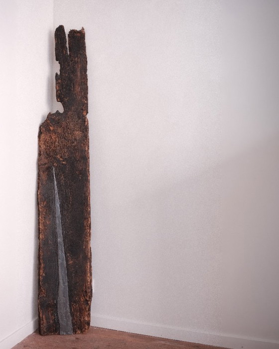Unique decorative art object in wabi-sabi and arte povera style. The heavy, weathered wood—charred, with rough, organic edges—bears a natural crack that was filled with cast lead. The lead follows the edges perfectly and has firmly anchored itself in the seams and pores of the wood. Two materials that have found each other.