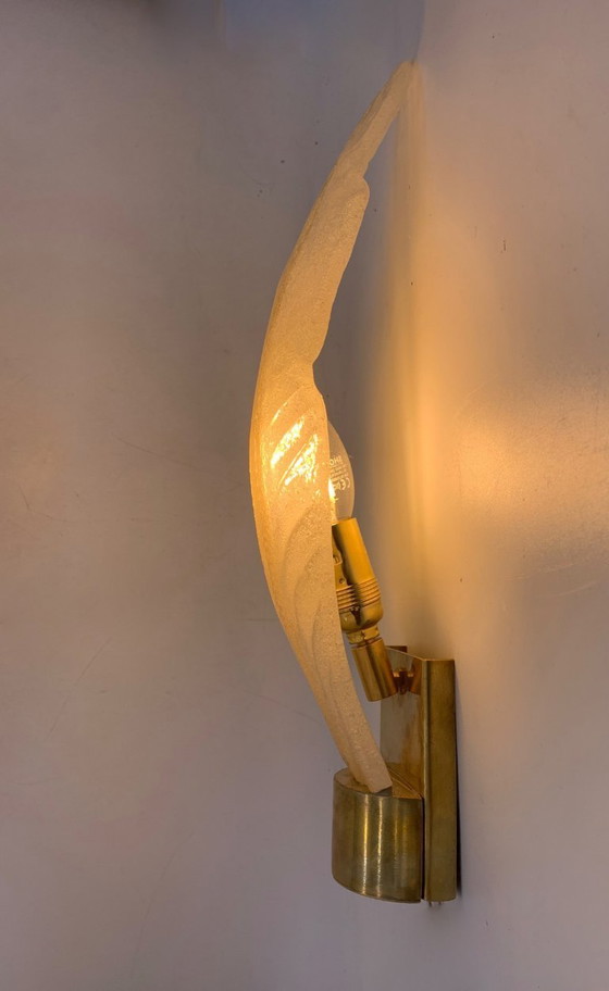 The lamp is a decorative wall light with a sculptural design inspired by the shape of a stylized leaf. Crafted from clear and milky glass with a pulegosa finish, the pulegosa technique creates a textured surface and diffuses light softly and evenly. The glass features diagonal incisions that accentuate the natural and dynamic effect of the shape. A vertical gold-plated metal element with a textured finish and exposed fixings runs through the center, adding an elegant contrast to the glass. The rectangular brass base supports and completes the structure, lending solidity and a refined aesthetic, making the lamp suitable for classic or contemporary settings with a strong decorative character.