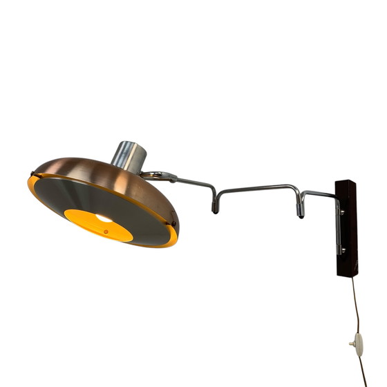 Height: 30 cm. Width: 25 cm (=Ø shade). Depth (max): 90 cm. The aluminum shade has some minor scratches from use. The lamp has a push switch and a large socket (E27). The lamp can be hung on 2 screws in the wall. Origin: the Netherlands, 1960s. Material: chromed steel, aluminum. All our lamps are suitable for LED bulbs.