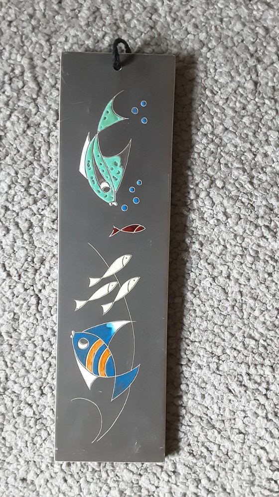 A black, signed and numbered wall tile by Arno Kiechle from Fornsbach, West Germany, 1950s. Height 34.5 cm, width 9.5 cm, with a fish motif.