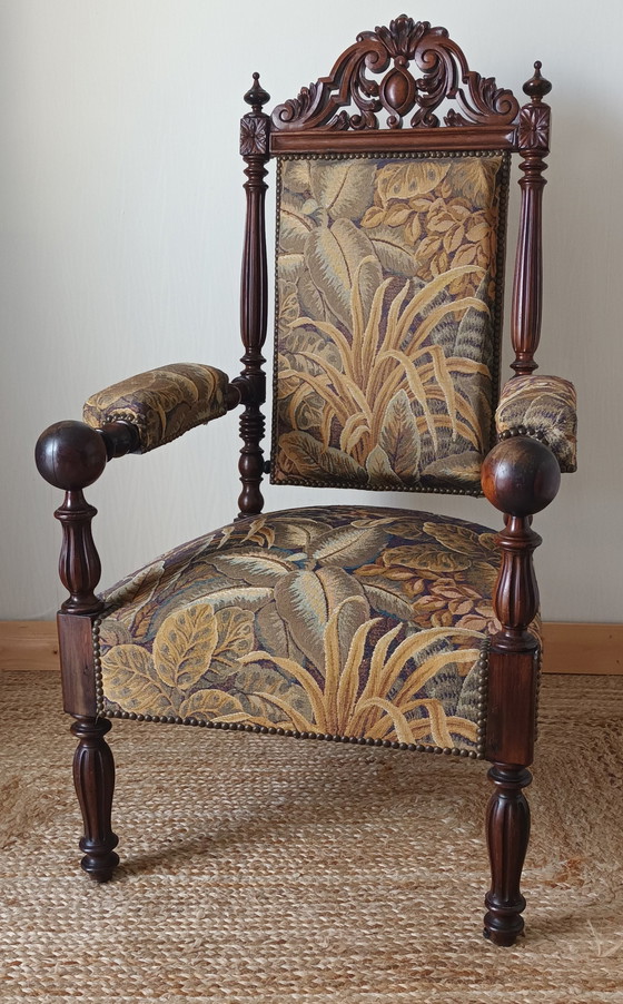 Neo-Renaissance style walnut armchair, beautifully carved and upholstered in thick studded fabric. Leaf and nature motifs.