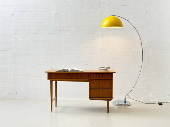 A simple desk in the style of the 1950s, featuring warm-toned walnut veneer and delicate, slightly tapered legs on small brass feet. The asymmetrical design, with a wide drawer on the left and a three-part drawer unit on the right, lends the desk an elegant, functional balance. Delicate, diamond-shaped brass handles and a pen tray underscore the charming character of a classic mid-century work desk.