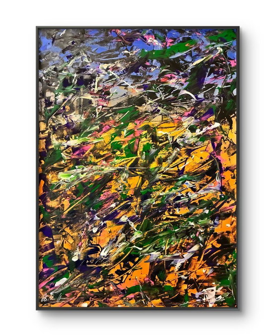 Bring home an explosion of color with this extraordinary abstract painting by Walter Geraci. A landscape that seems to dance before your eyes, with vibrant brushstrokes of green, orange, purple, and black intertwining in a play of light and shadow.