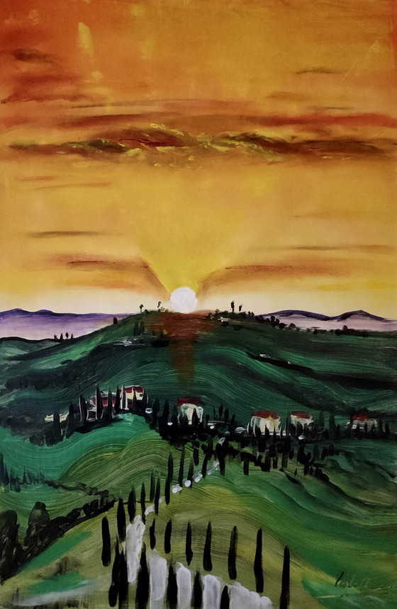 This is a stunning painting titled 'Tramonto' by Walter Geraci. The artwork beautifully captures a sunset over rolling hills, with vibrant colors of green, orange, and yellow. The impressionistic style adds a sense of movement and emotion to the landscape, making it a captivating piece for any art lover. The painting is on canvas and is in perfect condition, ready to enhance any space with its warm and inviting hues.