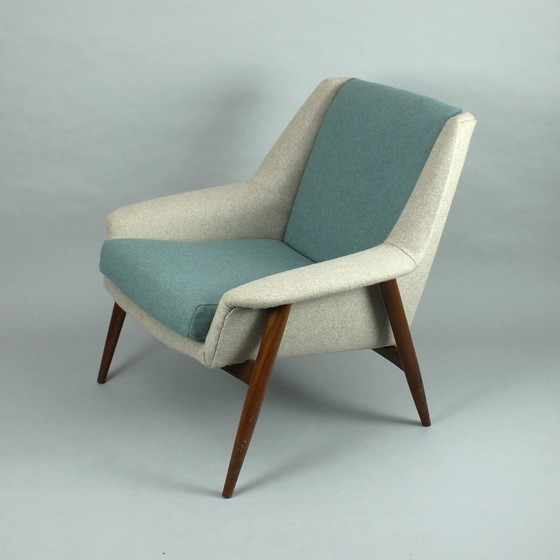 Cassina, Italy, 1960s. Cream and blue upholstered armchair on a walnut wood frame. The chair has been reupholstered in the past.