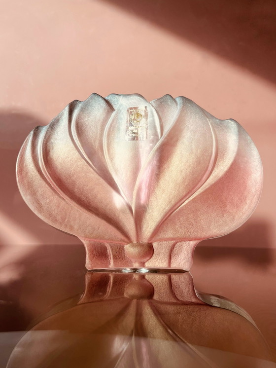 Luxurious 1970s Solifleur vase made of Walther crystal glass. The glass is cast in the shape of a textured lotus flower with a matte or iridescent pink and transparent finish.