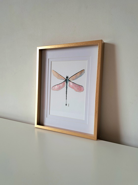 Handmade and original watercolor painting of a dragonfly. The dragonfly is finished with gold and pink metallic watercolor paint, creating a vibrant effect. Made on 300-gram paper and framed in a gold-colored frame with a double mat.