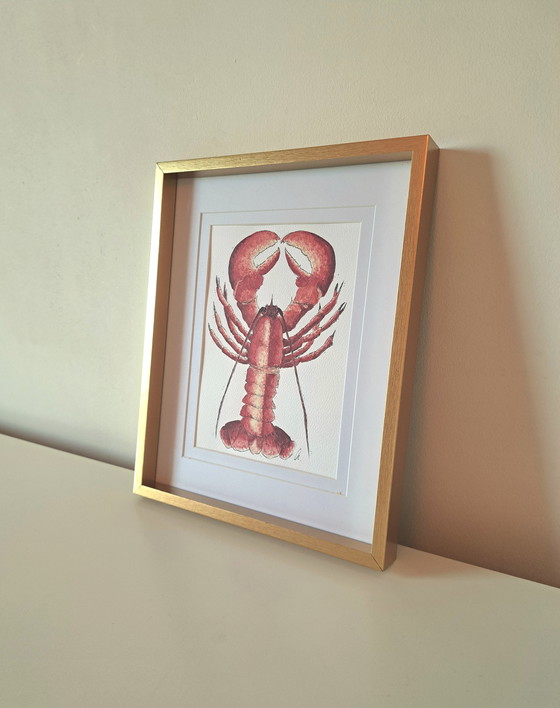 An original, handmade watercolor painting depicting a lobster. For anyone looking for a unique piece, there's only one of these. The watercolor is printed on 300-gram paper. The lobster watercolor illustration comes in a gold-colored 20x25 cm frame with a double mat.