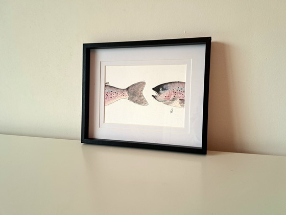Handmade and original watercolor painting of a rainbow trout. Created on 300-gram paper and presented in a black 20x25cm frame with a double mat.