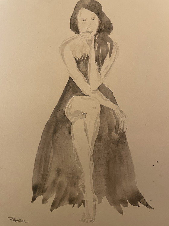 Watercolor Sepia Portrait of a Woman "La Robe Noire" (The Black Dress)