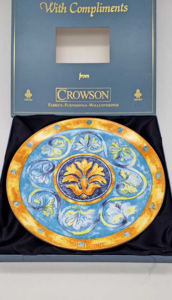This beautiful decorative Wedgwood plate, crafted from high-quality bone china, is an exclusive collector's item issued as a corporate gift by the renowned British textile company Crowson. The plate is part of a limited edition and is inspired by the iconic fabric designs for which Crowson was known in the 1980s and 1990s.