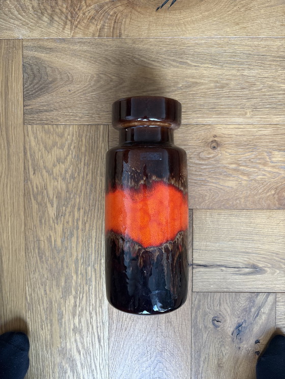This West German vase is a striking piece of vintage decor, featuring a bold red and brown glaze that captures attention. Its ceramic construction ensures durability while adding a touch of retro charm to any space. Perfect for displaying flowers or as a standalone decorative item, this vase is a testament to classic design.