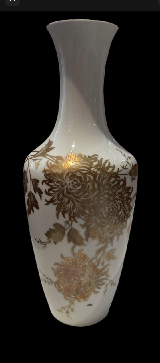Add a touch of vintage elegance to your home with this stunning West-Germany Kaiser Iris vase. Its sleek white porcelain body is beautifully adorned with intricate gold floral patterns, making it a perfect centerpiece for any room.