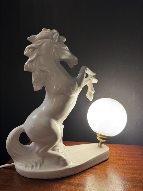 Large horse lamp from the 1970s/80s, rearing up, made entirely of white lacquered resin with a matte white opaline glass shade; very good overall condition (some minor wear consistent with age); for a small screw-in bulb.
