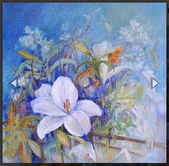 This beautiful painting titled "White Lily" depicts a delicate white lily surrounded by lush greenery and soft blue tones. Done in an impressionist style, the artwork captures the essence and beauty of nature with a soft and soothing color palette. The painting is on canvas and is framed, ready to be displayed in your home or office. It is a perfect piece for art lovers who love floral themes and impressionistic techniques. Original, oil painting by Coby van Wijk.