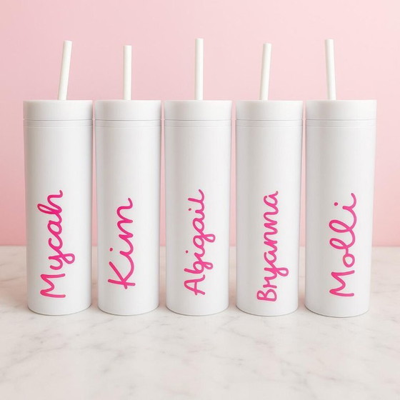 Elevate your gifting experience with these exquisite White Water Bottle Skinny Cups, perfect for bridesmaid and bachelorette gifts. Each cup is elegantly designed with a sleek white finish and personalized with vibrant pink lettering, adding a touch of sophistication and charm. Crafted from durable plastic, these cups are both lightweight and sturdy, making them ideal for travel or everyday use. The modern design ensures they complement any setting, from casual outings to formal events. Delight your loved ones with a gift that combines practicality with personalized elegance, making every sip a memorable experience.