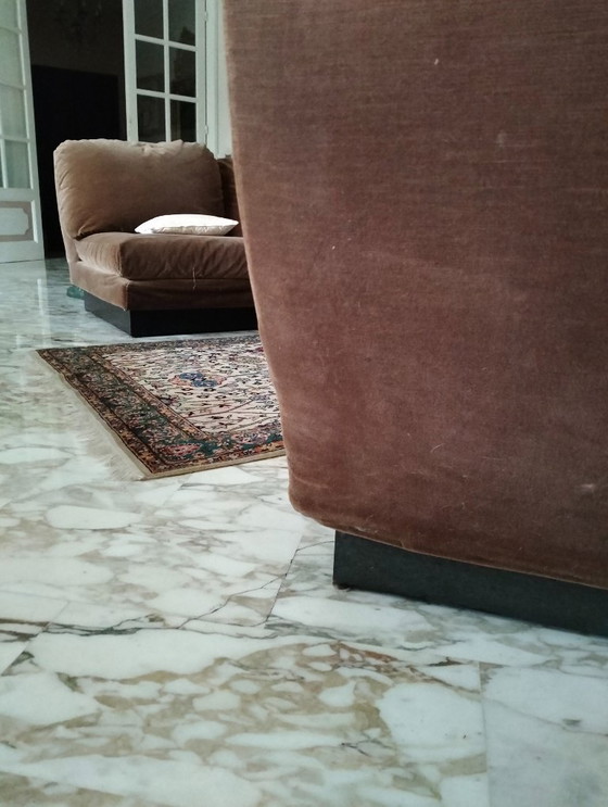 Discover the timeless elegance of the Willy Rizzo armchairs, a perfect addition for those seeking a touch of vintage class in their space. These armchairs, upholstered in a warm brown fabric, offer excellent comfort thanks to their generous padding and welcoming design. Beneath the fabric upholstery, the original pekari leather is still present, but shows signs of wear. Some seats require replacement of the straps.