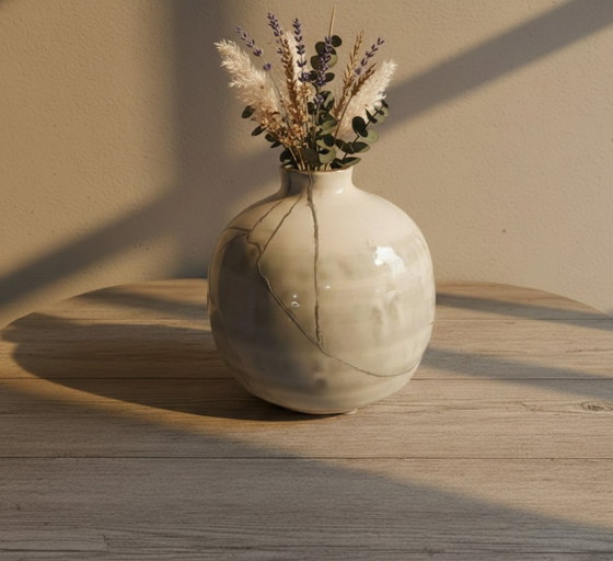 This 13 cm diameter spherical vase is distinguished by its mineral hues, oscillating between pure white and a misty gray. The cracks, testaments to the object's history, have been restored using the traditional Japanese method with natural Urushi lacquer.