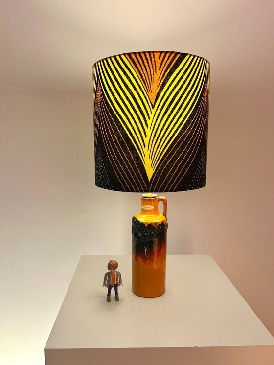 A true collector's item: This lamp is made from an original Kreutz Keramik vase with a handle, dating back to the 1970s, and features a high-quality lampshade made of African batik fabric. The vase bears both its original sticker and base mark and is a classic example of the Fat Lava era of the 1970s – bold glaze, textured lava surface, and warm, glowing orange tones contrasted with deep black.