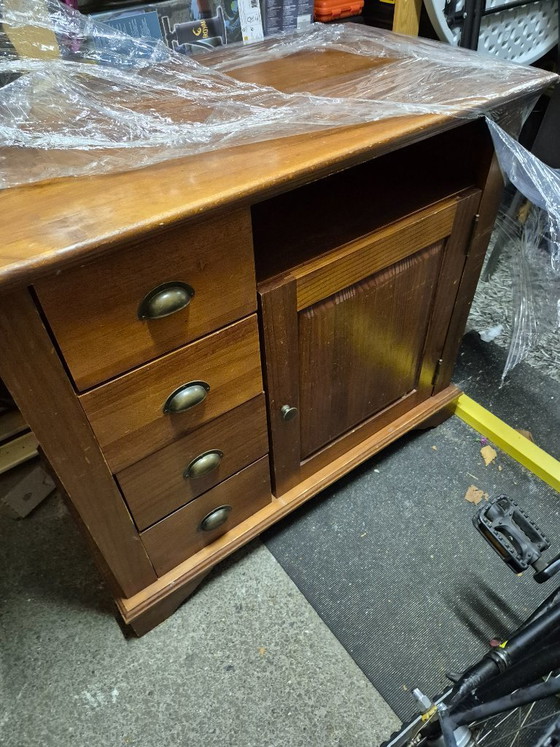 This charming wooden chest of drawers / sideboard is perfect for those looking for a blend of functionality and style. With its warm brown hue and vintage look, it adds a touch of nostalgia to any room. Ideal for storing all your belongings, from clothes to books, thanks to the spacious drawers and cabinet doors. The sturdy wooden construction ensures that this piece of furniture will last for years. Don't miss this opportunity to give your interior a unique touch!