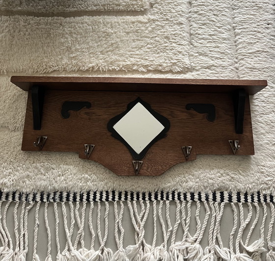 Beautiful, used wooden wall coat rack with a built-in mirror. Ideal for the hallway or entryway. It offers space for coats, scarves, and other accessories. It's 30 cm high, 85 cm wide, and 13 cm deep.