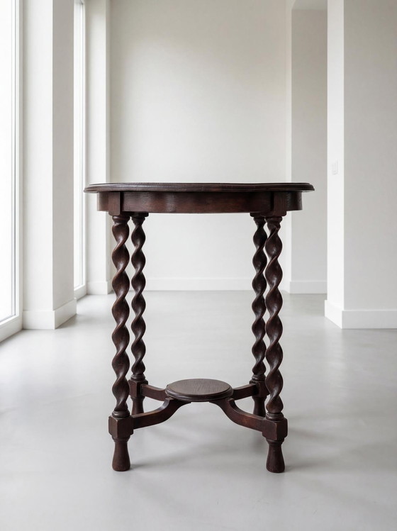 Charming antique side table with a dark wood top and striking turned legs. The table is 70 cm high and the top has a diameter of 59 cm.