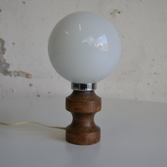 This wooden table lamp from the 1970s combines elegance with functionality. The design, featuring a glass globe and wooden base, exudes a warm atmosphere, perfect for any room. The lamp has original wiring and is suitable for EU sockets.