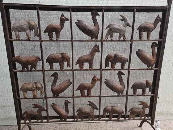 Bring a touch of rustic charm to your interior with this beautiful wrought iron fire screen. This unique piece, adorned with a series of animal figures, adds not only functionality to your fireplace but also an artistic element that catches the eye.