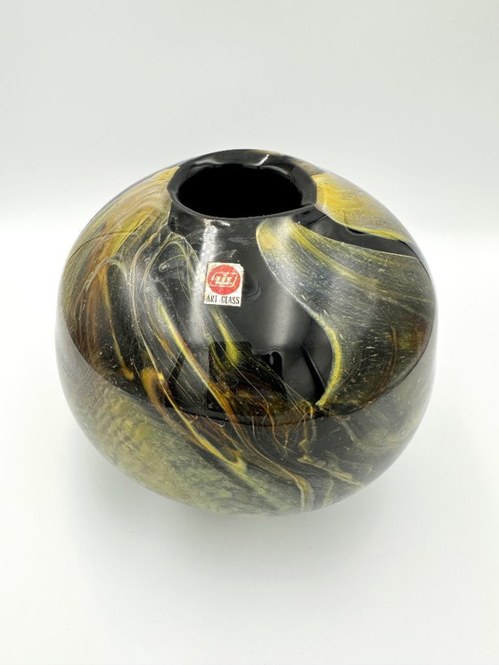 The vase is large and very heavy. It is made of black glass with yellow swirls and swirls. It is in very good vintage condition.