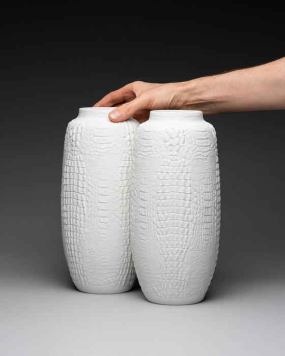 Mid-Century Modernist AK Kaiser Biscuit Porcelain Vase Duo – Crocodile Relief Design by Manfred Frey, Germany, 1970s
